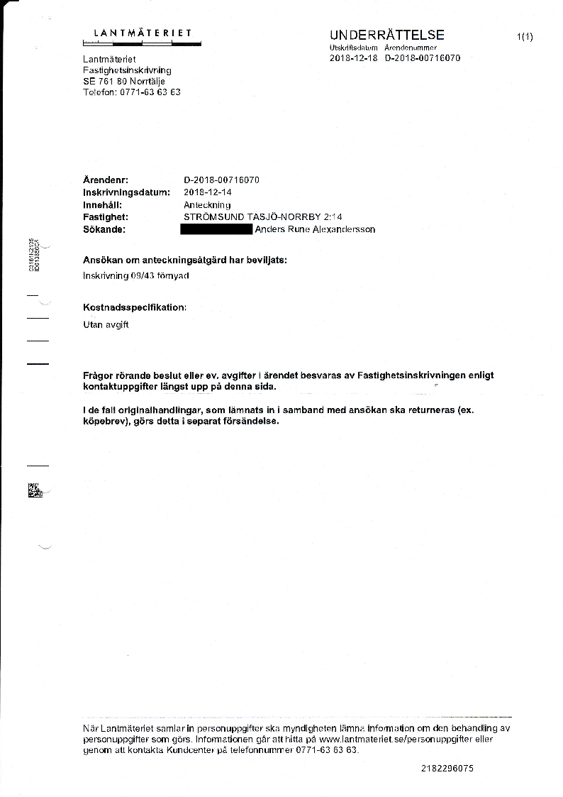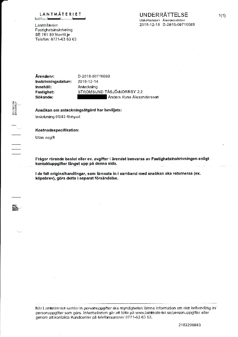 Nyttjanderätterna/avtalsservituten är förnyade i fastighetsboken med anledning av de konsekvenser som lagen (2013:488) om förnyelse av vissa inskrivningar i fastighetsregistret skulle medföra efter utgången av 2018. Nu återfinns inskrivningarna förnyade i fastighetsboken för Strömsund Tåsjö-Norrby 2:2 och Strömsund Tåsjö-Norrby 2:14 efter att jag med viss möda förnyat inskrivningarna.