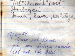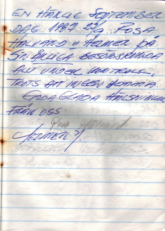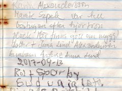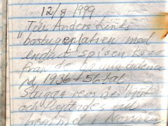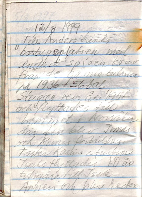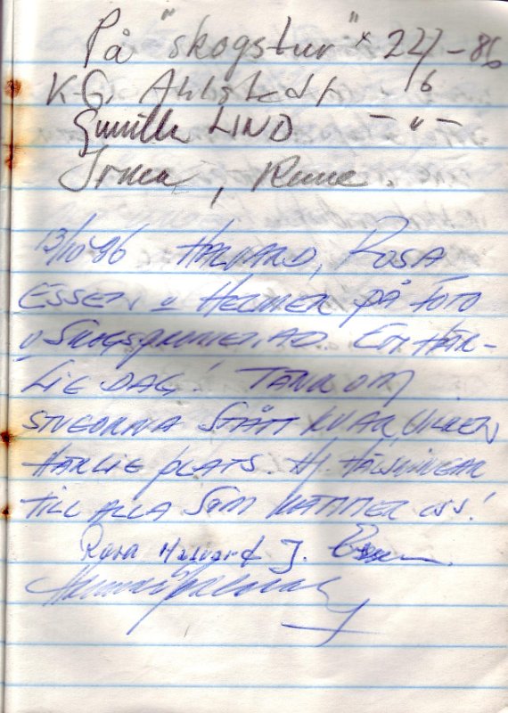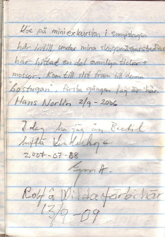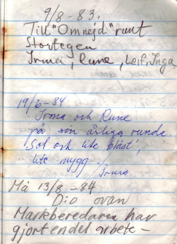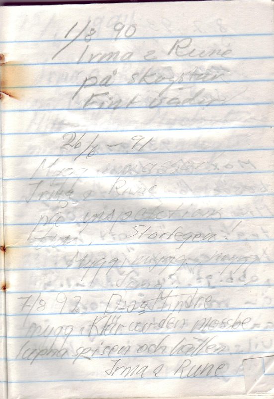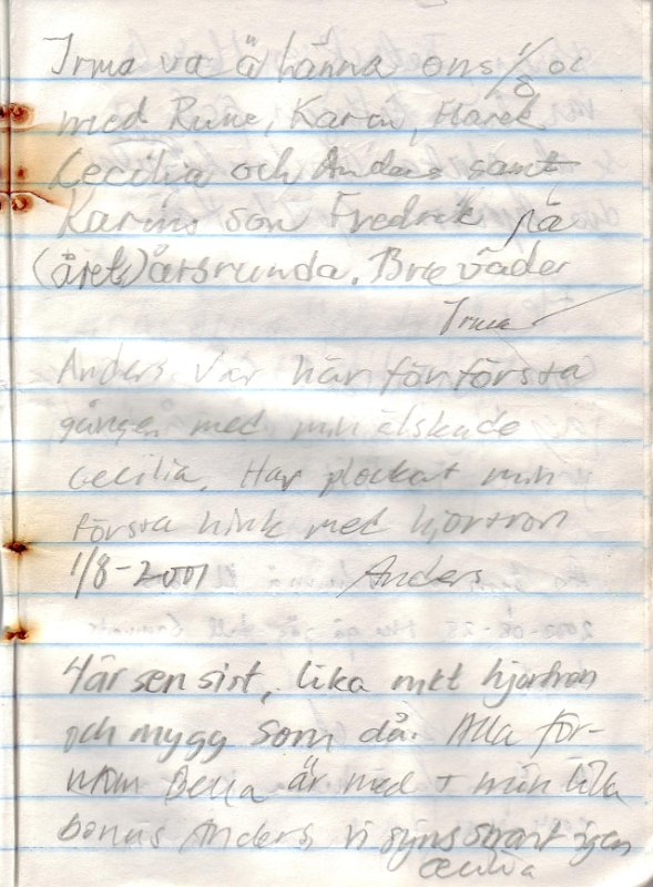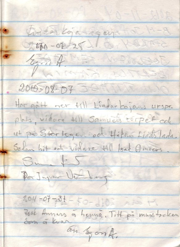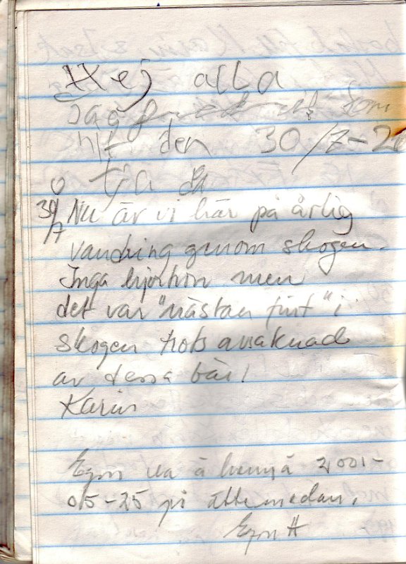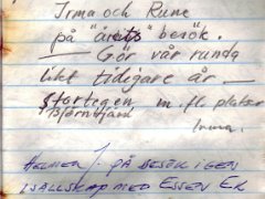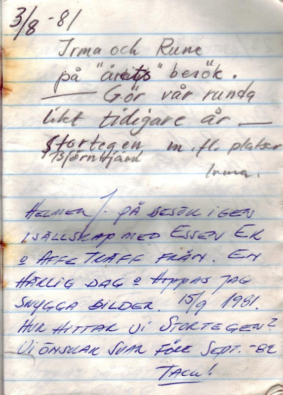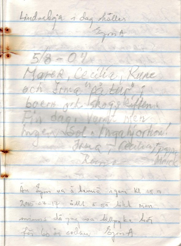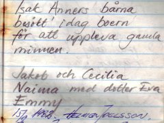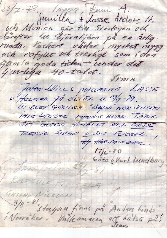 År 1974 lade Rune Alexandersson de första noteringarna och sedan i en "Gästbok" i den gamla järnspisen. Järnspisen tillhör huset han flyttade ned till Anders och Anna Linds hus som sin och Irmas sommarstuga. Huset ägs i dag av dottern Karin. Därefter har besökare fört in hälsninghar vid besök. Nu är besöksboken fulltecknad och det ligger en ny påbörjad på samma ställe i järnspisen. Om du passerar nyboern och järnspisen - skriv en hälsning!.